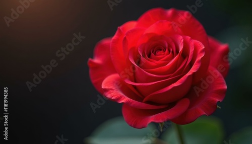 Close up of a vibrant red rose with a dark blurry background, symbolizing love, romance and beauty.