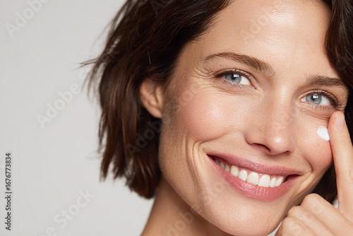 closeup, woman, smiling, applies, face cream, apply, beauty, face, smile, skin, people, person, hand, hair, brunette, lady, closeup, model, eye, care, 1, natural, teeth, looking, closeup, happiness, teenage, expression, head