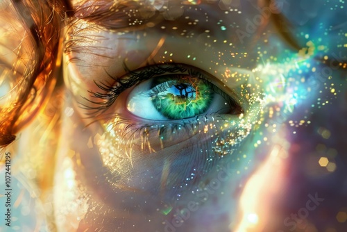 eye, woman, nature, sparkle, magic, overlay, close, up, green, colourful, light, beauty, vision, mysterious, fantasy, dreamlike, abstract, surreal, glistering, bokeh, glow, aura, energy, spiritual, connection, universe, galaxy, stardust, cosmic, aethereal, vibrant, feminine, portrait, detail, macro, iris, pupil, eyelash, make-up, cosmetic, double, exposure, composite, image, digital, art, illustration, wallpaper
