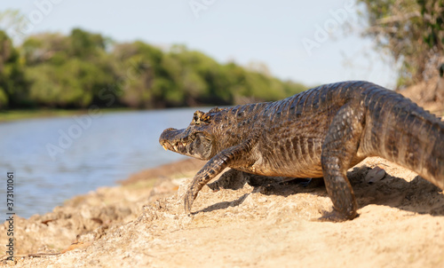 Close up of a Yacare caiman on a river bank