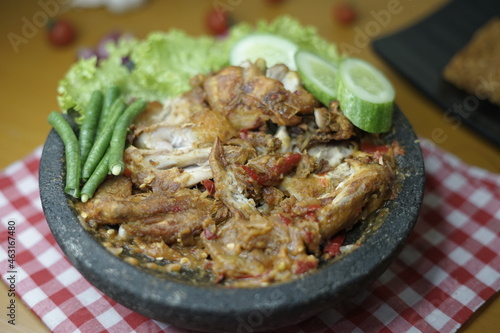 close up of ayam penyet traditional spicy sauce or sambal. fried chicken