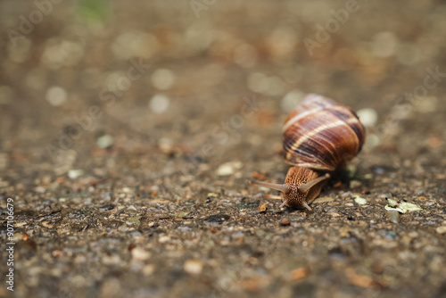 Close up of banner with snail crawling on wet asphalt looking for food, local fauna concept