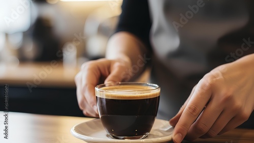 Close up of barista hands serving a fresh hot espresso coffee cup on a wooden table in a cafe