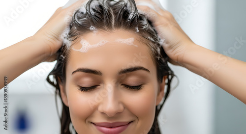 Close up of beautiful young woman washing her hair with shampoo foam in the shower