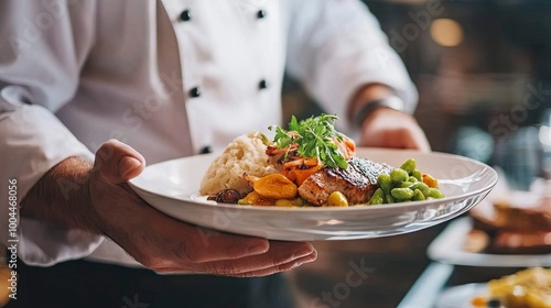 Close up of chef serving a dish in restaurant. generative ai