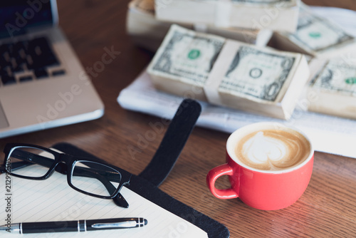 Close up of coffee cup, glasses, money, notepad, pen and laptop on wooden table