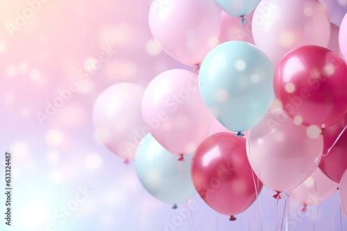 close up of colorful pink cyan tone balloons flying in the air, levitation,pink pastel background for design with copy space