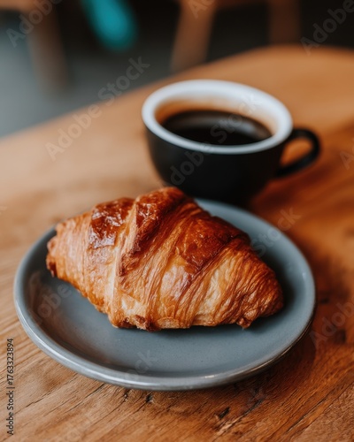 croissant, hot drink, breakfast, plate, cup, table, wood, cafes, food, drink, pastry, bakery, beverage, morning, snack, delicious, fresh, brown, black, grey, light, texture, surface, eatery, caffeine, aroma, baked, dough, gold, flaky, tasty, treat, simple, still, life, presentation, epicure, enjoyment, indulgence, comfort, culinary, rustic, nobody, close, up, shot