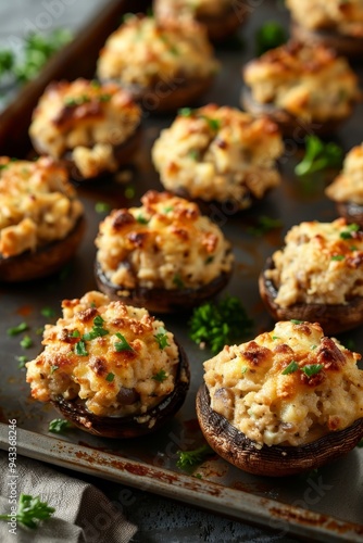 Close Up of Delicious Baked Stuffed Mushrooms with Cheese and Herbs Fresh from the Oven.