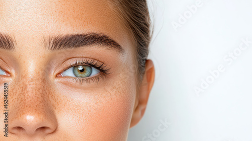 Close up of female face showcasing natural beauty, featuring clear skin, defined eyebrows