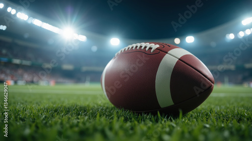 close up of football on grassy field, illuminated by stadium lights, evokes excitement and anticipation for game