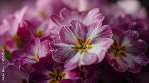 Close up of garden pink and mauve primula flowers, entrance their subtle grace.