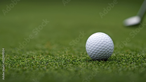 close up of golf ball resting on lush green grass, capturing texture and detail of ball. scene evokes sense of anticipation and focus in game of golf