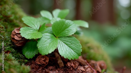 Close up of green leaves and pine cones on mossy ground in a forest Nature