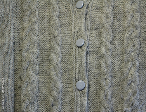 Close up of grey old knitted wool texture background. Handmade gray knitted sweater with grey plastic buttons.