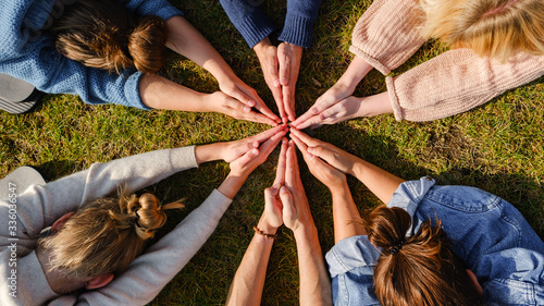 Close up of hands of people sitting outdoors on green grass after doing yoga