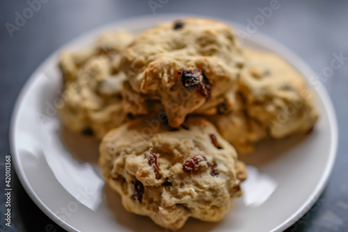 Close up of homemade fruit scones with intentional shallow depth of field and bokeh