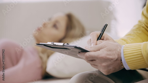 close up of mature psychotherapist writing on clipboard near blurred patient