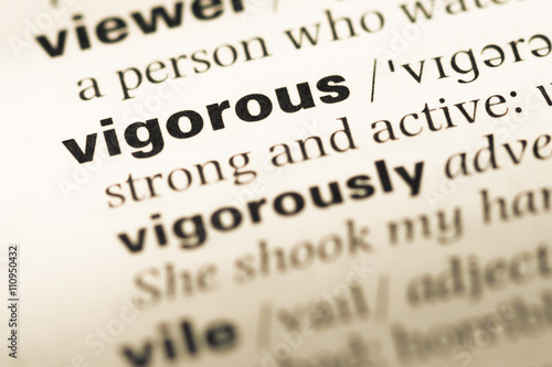 Close up of old English dictionary page with word vigorous