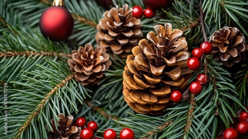 Close up of pine cones and red berries, great for nature and outdoor themed designs