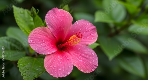 close up of pink flower Petals and Moisture Droplets on Green Leaves