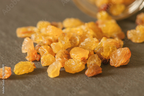 Close up of scattered tasty dried raisins and glass jar on tabletop in kitchen