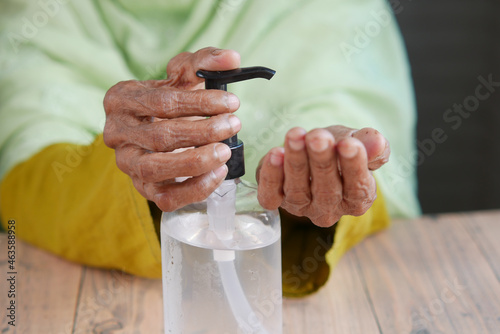 close up of senior women hand using sanitizer gel for preventing virus