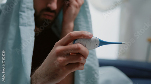 Close up of sick man looking at thermometer measuring fever and flu symptoms. Adult with virus infection using medical device to check temperature wrapped in blanket, feeling cold.