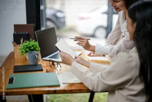 Close up of two businesswomen working using digital tablets Consult and plan together. Brainstorm, share and discuss business project ideas.