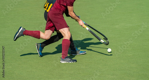 Close up of two field hockey players, challenging eachother for the control and posession of the ball during an intense, competitive match on professional level. Team sport concept