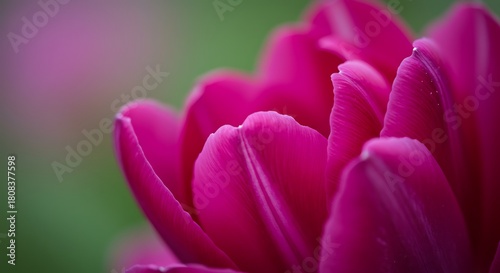 Close up of vibrant pink flower petals against a blurred green backdrop