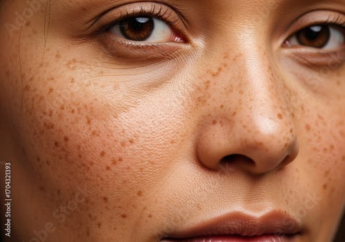Close Up of Woman's Face with Freckles, Skin Blemishes, and Natural Texture