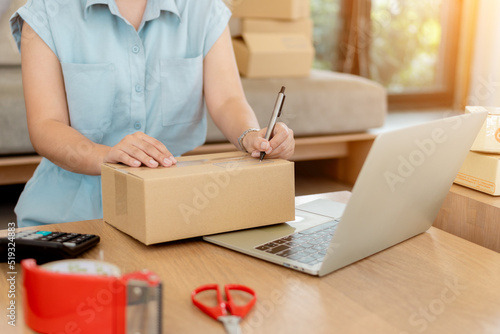Close up online business owner prepares product for delivery to the customer. Online entrepreneur writing address on parcel box for delivery to customer. small business owner, SME concept.