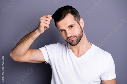 Close up photo amazing he him his macho perfect appearance hands arms plastic hair styling brush take care hairdo after barber shop stylist visit wear casual white t-shirt isolated grey background