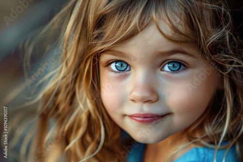 Close up portrait of a charming young girl with captivating blue eyes and beautiful blonde hair