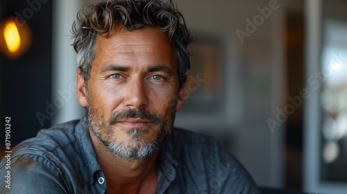 man, portrait, face, close, middle, aged, grey, hair, goatee, beard, eye, green, blue, shirt, sharpened, blur, background, indoor, studio, head shot, male, adult, professional, serious, confident, mature, photogenic, attractive, model, human, person, facial, expression