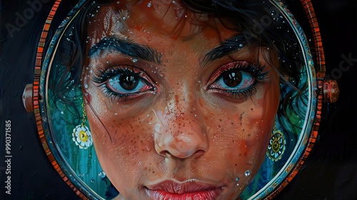 freckle, realistic, digital artwork, perspective, art, abstract, waterdrop, make-up, mystical, fantasy, mirror, expression, female, surrealism, eye, composition, emotion, painting, light, eyeliner, woman, face, portrait, sharpened, closeup, fine art, texture, detail, shadow, intriguing, style, colours, mood, skin, beauty, eyebrow, lip, dreamy