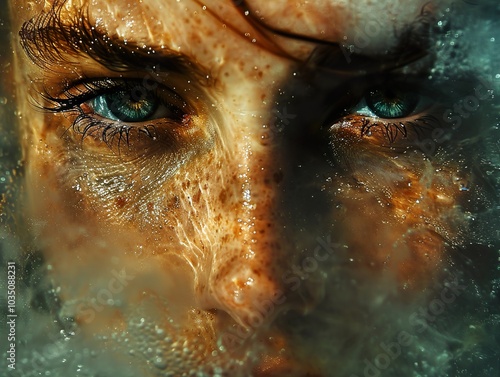 portrait, art, mysterious, texture, shadow, submerged, beauty, gaze, mystical, emotion, gold, wet, photo, green, closeup, face, hidden, shimmering, surreal, sensual, light, skin, human, intense, water, intriguing, digital artwork, sparkling, secret, enigmatic, abstract, underwater, eye, dreamy, powerful, freckle, fantasy, depth, female