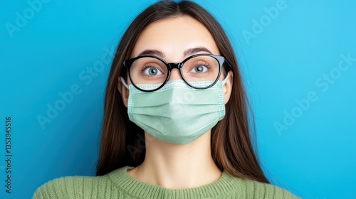woman, portrait, face, mask, goggles, eye, blue, background, green, sweater, close, up, young, female, fashion, health care, protection, health, safety, medicals, pandemic, virus, prevention, style, expression, serious, focused, closeup, head shot, studio, shot, lifestyle, photo, person, model, attractive, beautiful, healthy, careful, responsible, concerned, thoughtful, casual attire, everyday, real, authentic, natural, candid