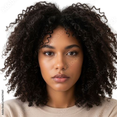 woman, portrait, closeup, curly hair, brown eyes, female, young, isolate, beauty, natural, fashion, people, skin, face, hair, head shot, shoulder, expression, neutral, looking, studio, isolated, professional, lifestyle, human, casual attire, adult, model, genuine, appearance, simple, profile, clear