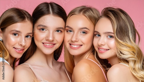 Close up portrait of four beautiful girls with clear skin, soft glow, isolated on pink background. The concept of advertising cosmetology services