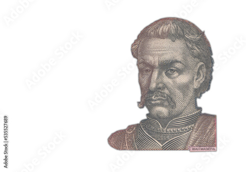 Close up portrait of Ivan Mazepa, Hetman of Zaporizhian Host isolated from Ukrainian 10 hryvnia banknote. Ukrainian famous people. Copy space.