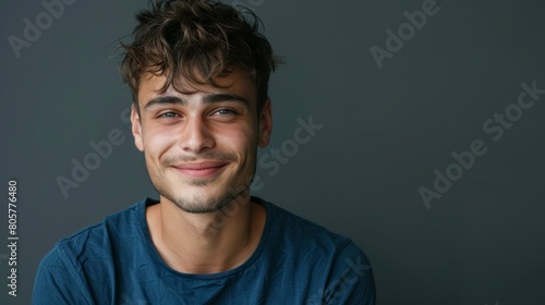 Close up portrait of young smiling handsome guy in blue t-shirt isolated on gray background hyper realistic