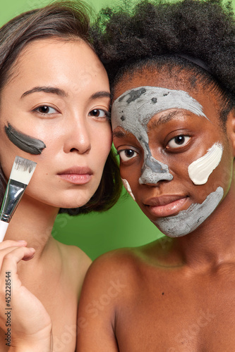 Close up shot of diverse young women apply clay masks on face hold cosmetic brush look directly at camera stand shirtless indoor take care of complexion and skin isolated over green background