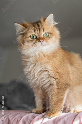 Close Up Shot Orange and Cream Long Hair Scottish Fold Straight Cat Kitten Close up With Sun Beam Green Eyes on Pink Sheets in the Morning