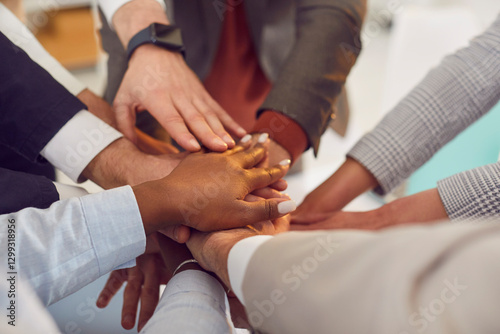 Close up top view photo of diverse business people putting their arms together. Stack of hands of a group of multiethnic company employees. The concept of unity, partnership and teamwork.