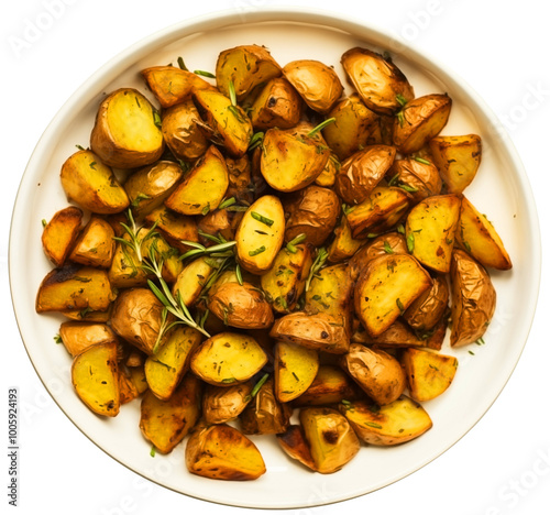 Close Up Top View To a Crispy roasted potatoes PNG on a plate with Green herbs isolated on white and transparent background - Baked Golden potatoes recipe Food Concept