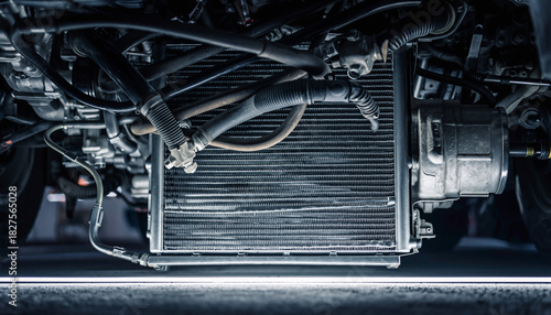 automotive, engine, cooling, radiator, condenser, machinery, vehicle, transport, undercarriage, mechanical, repair, maintenance, system, pipe, hose, structure, industrial, closeup, detail, metal, component, part, technology, transportation, automobile, technical, infrastructure, grime, worn, service, diagnostic, thermal, heat, exchange, fluid, heavy duty, underneath