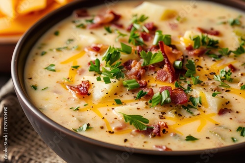soup, potato, cheese, loaded, vertical, bowl, cheddar, bacon, food, white, health, green, colours, cooking, healthy, colourful, diet, vegetable, organic, nourishment, cream, dinner, meal, cookery, epicure, lunch, eating, baked, onion, spoon, culinary, parsley, seasonal, broth, pot, lid, starter, closeup, creamy, fresh, homemade, hot, pan, tasty, thick, warm