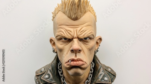 sculpture, bust, mohawk, punk, leather, jacket, portrait, man, art, figurative, beige, gritty, textured, detailed, realistic, closeup, head, face, expression, angry, serious, rebellious, style, fashion, subculture, contemporary, three-dimensional, artwork, craft, hand-made, artist, creation, figurine, collectable, model, display, home, decor, object, masculine, strong, rebel, rough, intense, hard, bold